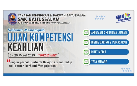 Uji Kompetensi Kejuruan (UKK) 2022 - 2023 Operator Pengelola 14 Maret 20230 Comments513 PembacaTanggalRabu, 08 Maret 2023Waktu7:00:00TempatSMK Baitussalam PekalonganJadwal Ujian Kompetensi Kejuruan UKK 2022-2023Bagikan : Previous postNext post KomentarForm KomentarAgenda Baru2602-2024Penilaian Sumatif Akhir Tahun (PSAT Genap) 7:00:002602-2024SUMATIF TENGAH SEMESTER (STS Genap) 7:13:152911-2023Penilaian Akhir Semester & Sumatif Akhir Semester .. 7:00:002509-2023PTS & STS Gasal Tahun Pelajaran 2023-2024 7:00:002808-2023Asesmen Nasional Berbasis Komputer (ANBK) Tahun 20.. 7:00:00SearchCategoryInfo Beasiswa1Informasi15Karir1Pengumuman1Tips Belajar3Blog Terbaru 31 Agustus 2025KEMAH TANGGUH PEMUDA 2025 04 Desember 2025Masa Pengenalan Lingkungan Sekolah SMK BAITUSSALAM PEKA.. 15 Januari 2025PPDB SMK BAITUSSALAM PEKALONGAN 2025 13 Januari 2025Serah Terima Jabatan Pengurus Organisasi SISWA SMK Bai.. 05 Maret 2024PPDB SMK Baitussalam Pekalongan 2024/2025PopulerWorkshop Komite Sekolah dan Pihak Perusahaan 17 Oktober 2023Lomba Membatik Tingkat SMA/MA/SMK 21 Oktober 2023Lomba Bakiak Tingkat Provinsi 12 Juni 2023Lomba Kompetensi Siswa Tingkat Kota Pekalongan Tahun 20.. 27 Februari 2024Lomba Dalam Rangka HUT RI Dinpora Kota Pekalongan Dan F.. 12 Agustus 2023DownloadAa 356 B 2387 DownloadPanduan Siswa Ujian 592.1 KB 9204 DownloadTagsKarirTipsInformasi