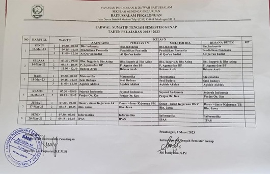 Sumatif Tengah Semester Genap 2022 - 2023 Operator Pengelola 14 Maret 20230 Comments1013 PembacaTanggalSenin, 13 Maret 2023Waktu7:00:00TempatSMK Baitussalam PekalonganBagikan : Previous postNext post KomentarForm KomentarAgenda Baru2602-2024Penilaian Sumatif Akhir Tahun (PSAT Genap) 7:00:002602-2024SUMATIF TENGAH SEMESTER (STS Genap) 7:13:152911-2023Penilaian Akhir Semester & Sumatif Akhir Semester .. 7:00:002509-2023PTS & STS Gasal Tahun Pelajaran 2023-2024 7:00:002808-2023Asesmen Nasional Berbasis Komputer (ANBK) Tahun 20.. 7:00:00SearchCategoryInfo Beasiswa1Informasi15Karir1Pengumuman1Tips Belajar3Blog Terbaru 31 Agustus 2025KEMAH TANGGUH PEMUDA 2025 04 Desember 2025Masa Pengenalan Lingkungan Sekolah SMK BAITUSSALAM PEKA.. 15 Januari 2025PPDB SMK BAITUSSALAM PEKALONGAN 2025 13 Januari 2025Serah Terima Jabatan Pengurus Organisasi SISWA SMK Bai.. 05 Maret 2024PPDB SMK Baitussalam Pekalongan 2024/2025PopulerWorkshop Komite Sekolah dan Pihak Perusahaan 17 Oktober 2023Masa Pengenalan Lingkungan Sekolah SMK BAITUSSALAM PEKA.. 04 Desember 2025PurnaTugas Guru Pemasaran Bapak Drs.Mualip 06 September 2023Lomba Dalam Rangka HUT RI Dinpora Kota Pekalongan Dan F.. 12 Agustus 2023PPDB SMK BAITUSSALAM PEKALONGAN 2025 15 Januari 2025DownloadAa 356 B 2369 DownloadPanduan Siswa Ujian 592.1 KB 9190 DownloadTagsInformasiTipsKarir